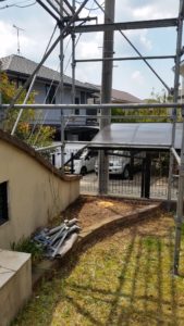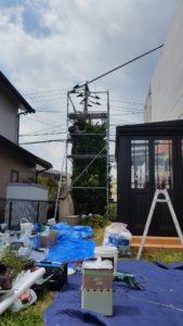 今回、塗装工事と合わせて、コニファー回りにも足場をかけて上から枝を落としてカットしていきました。