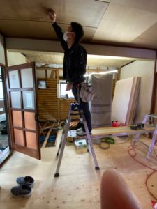 今回は若手大工さん、元気に天井を貼っていきます。
