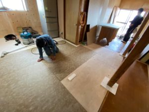 器具の設置が終わると、仕上げの床材を貼っていきます!