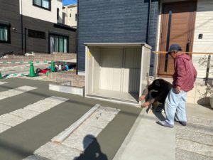 先に施工しておいたコンクリートの土台に、既存の物置を移設します😀